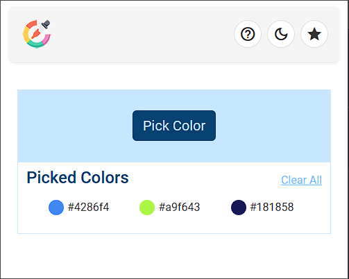 Picked colors are neatly displayed in a dedicated section, allowing you to review, copy, or clear selections with a single click. Whether you're working on a single design or juggling multiple projects, the extension helps you stay organized. Each color swatch is labeled with its hex code, making it easy to transfer into design tools, CSS files, or documentation. The “Clear All” option lets you reset your palette instantly, so you can start fresh whenever inspiration strikes.